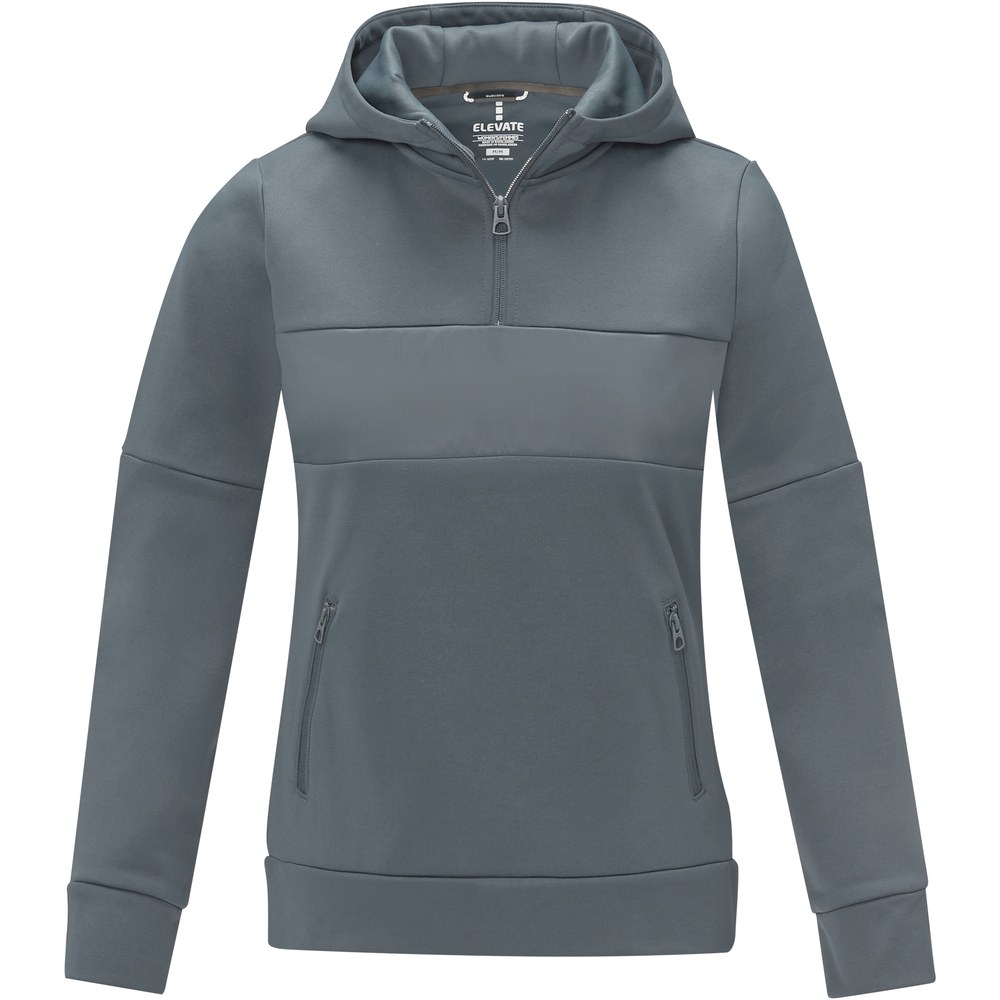 Sayan anorak hættetrøje med halv lynlås til kvinder - en unik kombination af ydeevne og stil. Anorakdesignet kombinerer mode og funktion uden problemer og har en kvart lynlås, så man kan tage flere lag på. Fremstillet af en 350 g/m²-blanding af polyester og Sorona® strik. Sorona® fiberen forbedrer jakkens miljøvenlighed ved at inkorporere et ansvarligt element uden at gå på kompromis med ydeevnen. Kontraststoffet på frontpanelet, der er lavet af 280T ripstop nylon, bidrager til designet med sin holdbarhed og tekstur og er det ideelle sted at fremvise dit brand. Uanset om du begiver dig ud på et udendørs eventyr eller bare navigerer i din daglige rutine, kombinerer Sayan hættetrøjen ubesværet mode med funktion. Sweateren er designet med en tætsiddende form, der giver et feminint look.