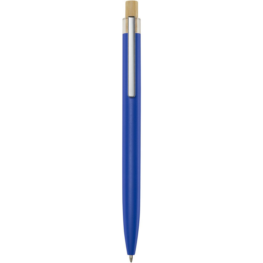 Nooshin kuglepennen er lavet af genvundet aluminium, som kræver mindre energi end at producere aluminium fra råmaterialer. Det reducerer også mængden af affald på lossepladserne og bidrager til at bevare naturressourcerne med henblik på at reducere drivhusgasemissionerne. Trykknappen er fremstillet af bambus. Blækfarve: Sort Skrivelængde: 800 meter. Spidsstørrelse: 1,00 mm.